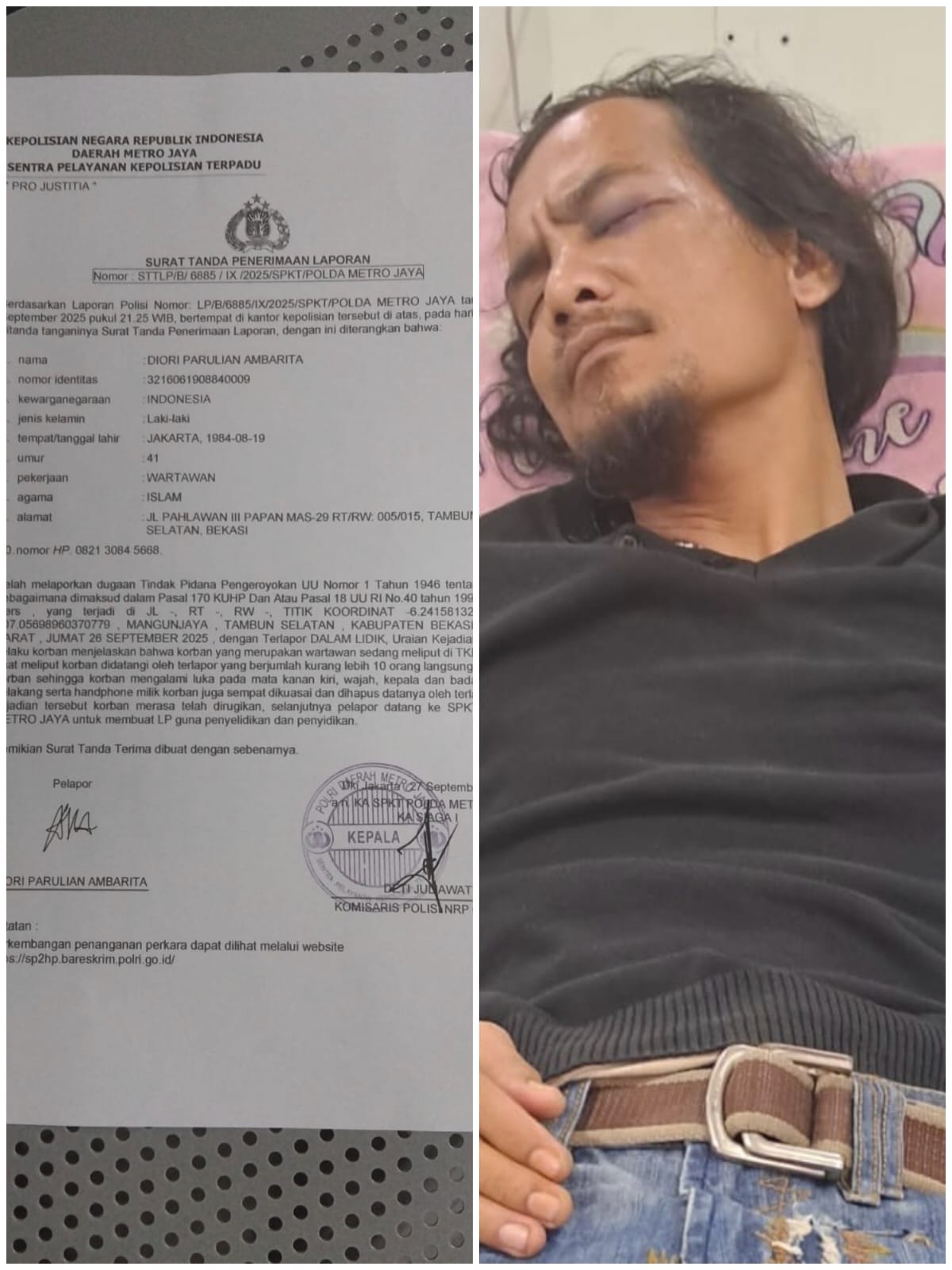 Laporan dengan nomor: STTLP/B/6885/IX/2025/SPKT/POLDA METRO JAYA itu menyebutkan bahwa insiden terjadi pada Jumat, 26 September 2025 di wilayah Mangunjaya, Tambun Selatan, Kabupaten Bekasi. Diori yang sedang meliput sebuah kejadian di lapangan tiba-tiba dikeroyok oleh sekitar 10 orang tak dikenal.